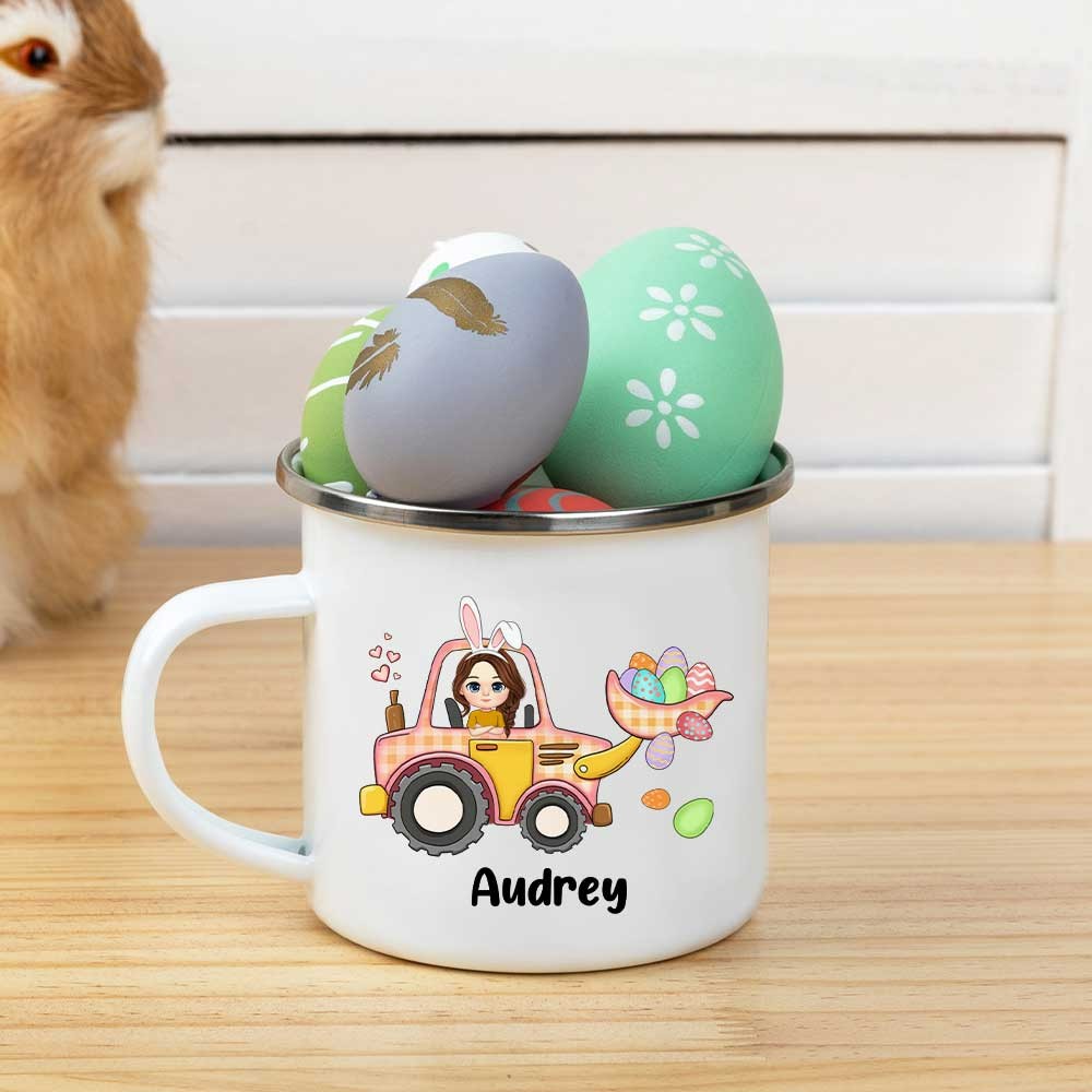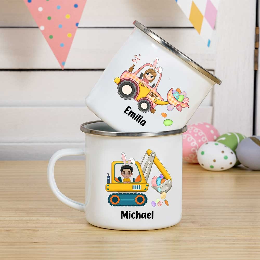 Custom Cute Cartoon Character Excavator Easter Egg Hunt Mug, 11oz Easter Enamel Mug for Hot Chocolate/Coffee/Tea, Easter Gift for Boys/Girls