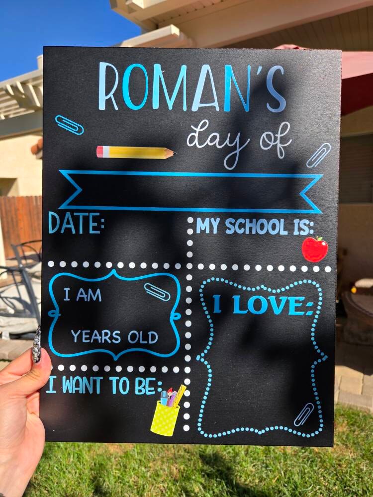 This reusable first and last day of school chalkboard sign comes custom printed (not a decal) with the name and template shown on an actual physical chalkboard. This chalkboard sign is a great back to school photo prop that you can use again at the end of the school year to document all of your child's milestones.
