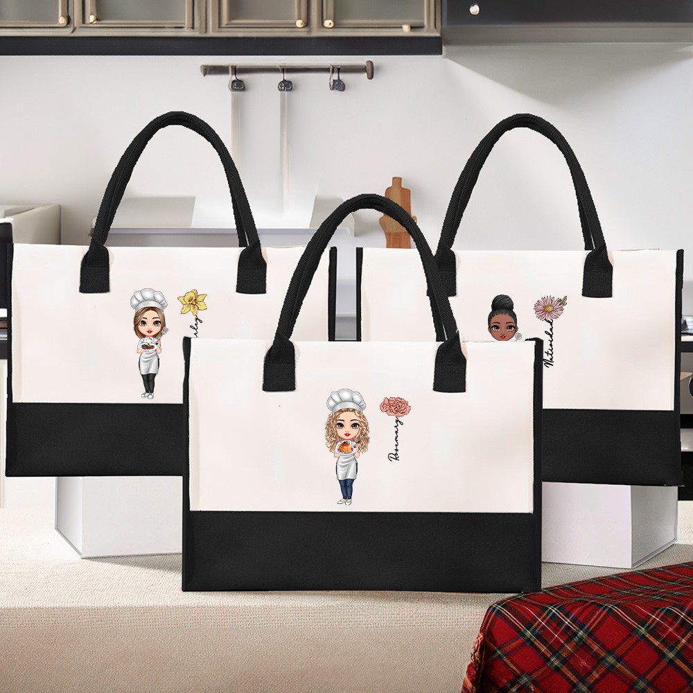 Custom Design - This delightful tote bag features a charming cooking Mama clipart design, personalized with your name and birth flower. It’s a unique way to showcase your personality while shopping or cooking.