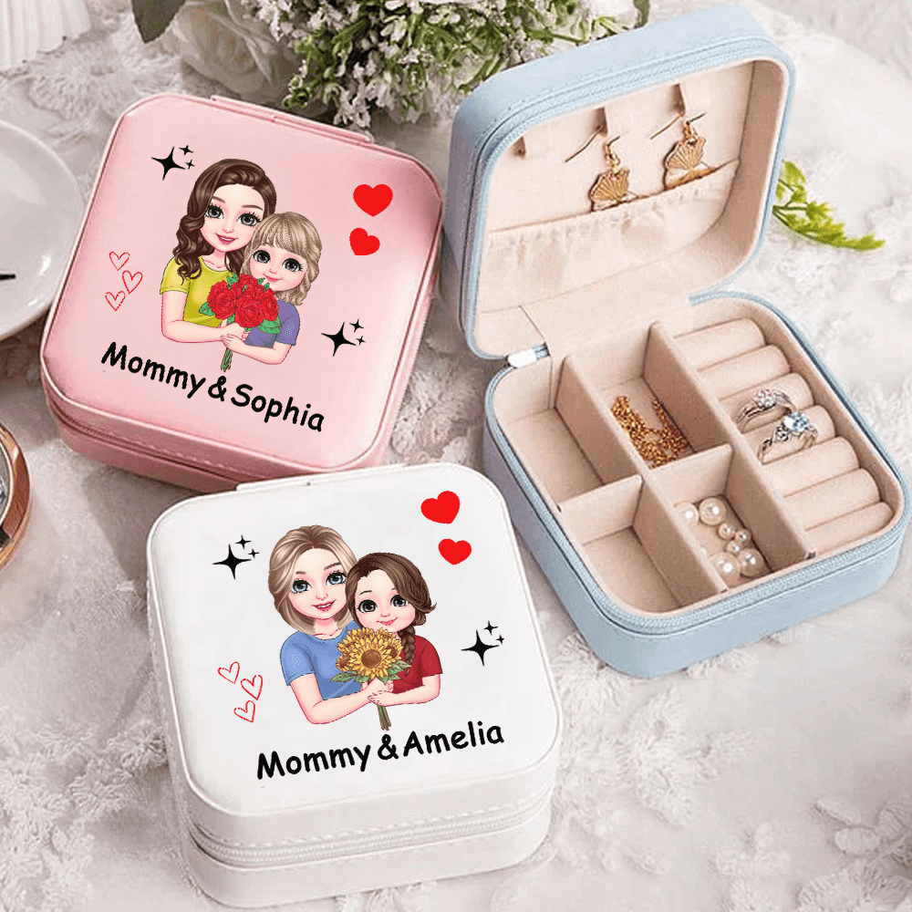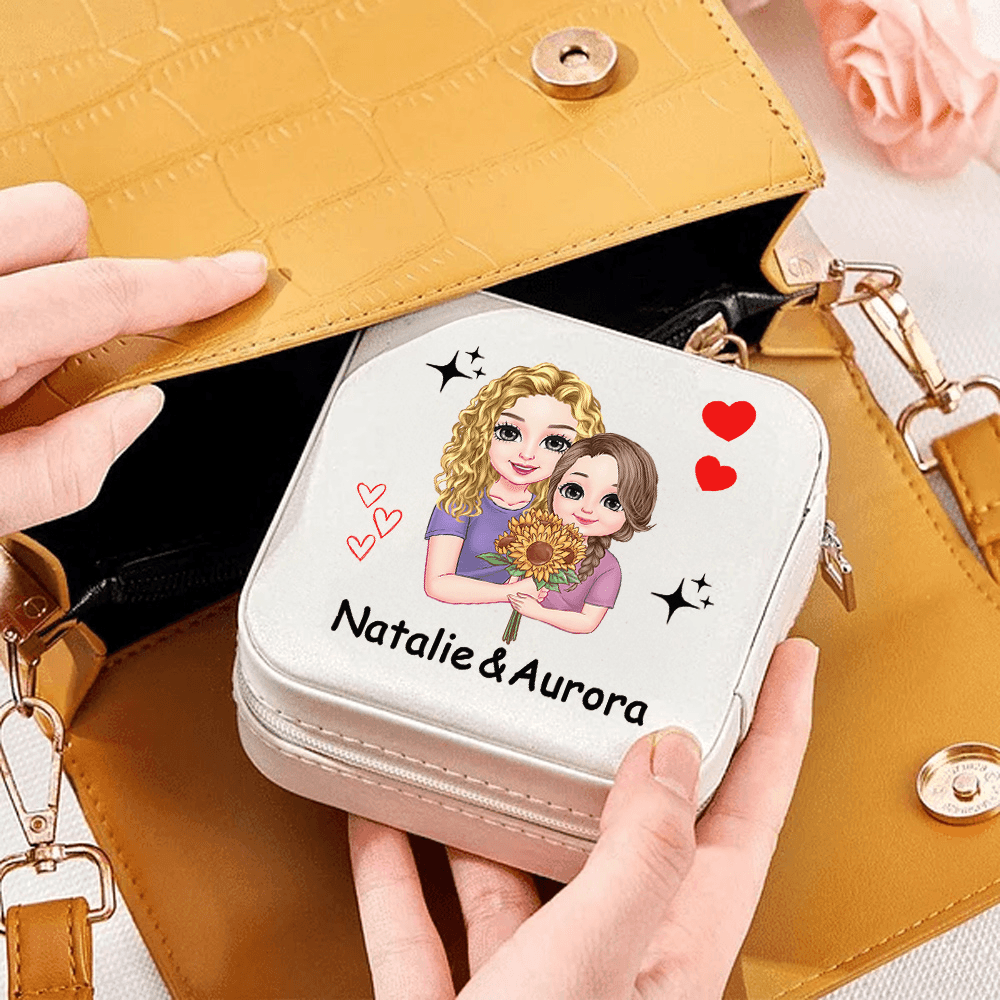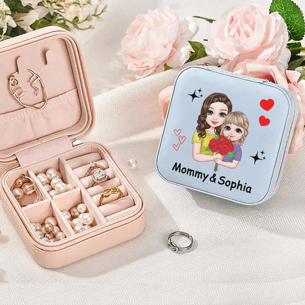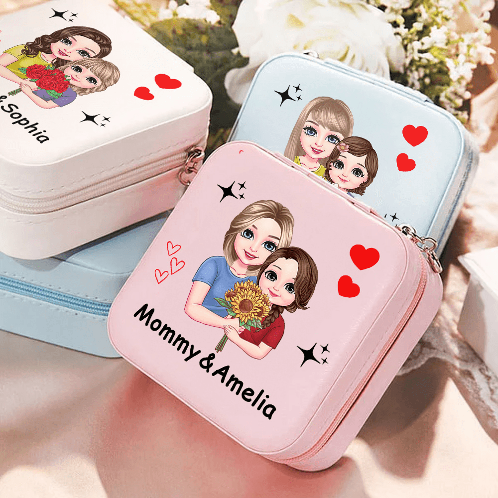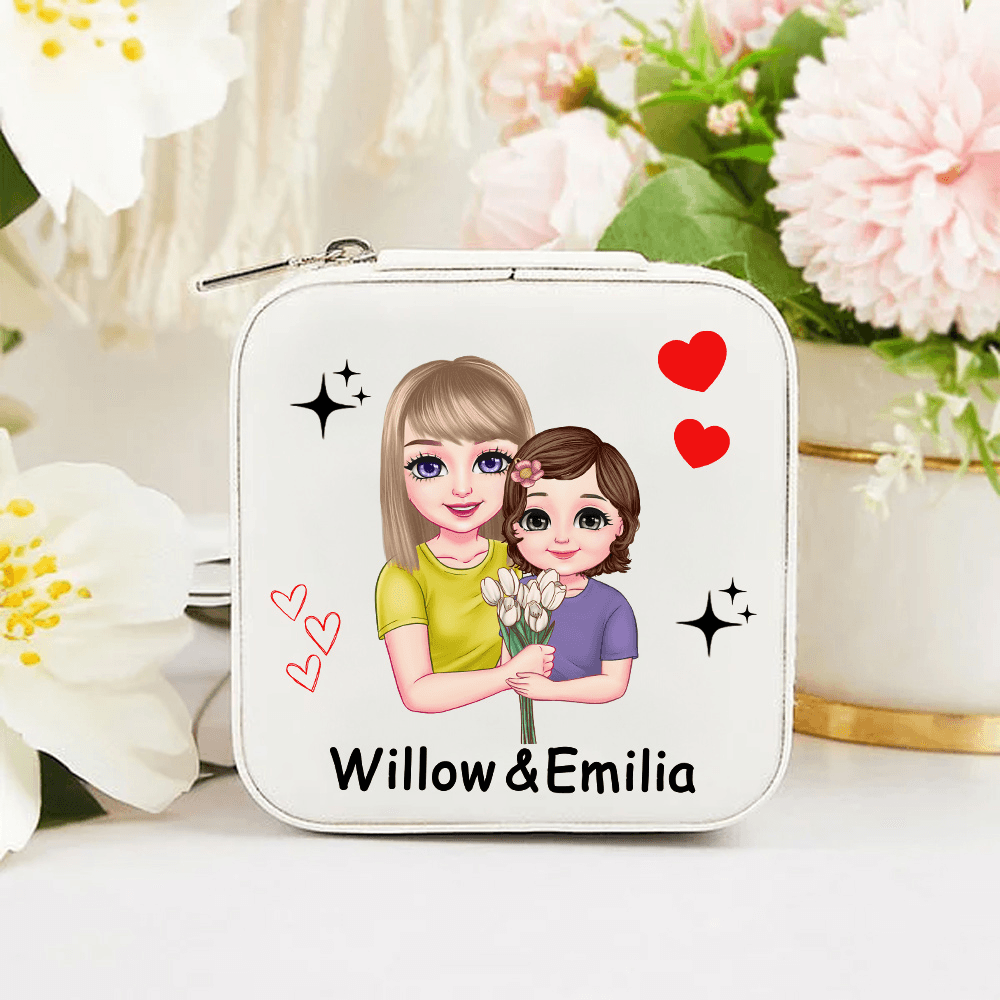 Personalized Touch - This jewelry box features a charming cartoon character design of mom and daughter, personalized with their names. It’s a heartfelt and unique keepsake celebrating the special bond between mother and daughter or grandma.